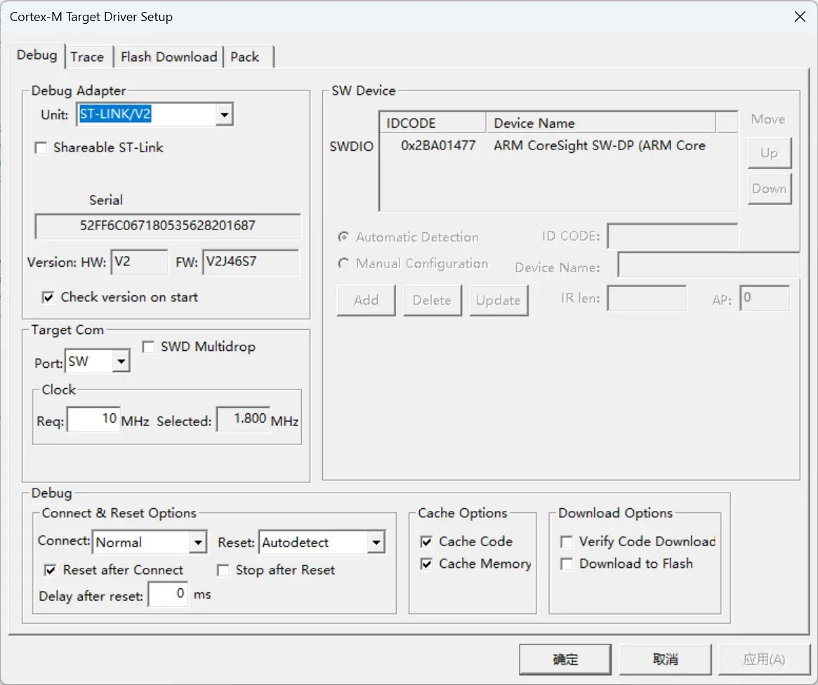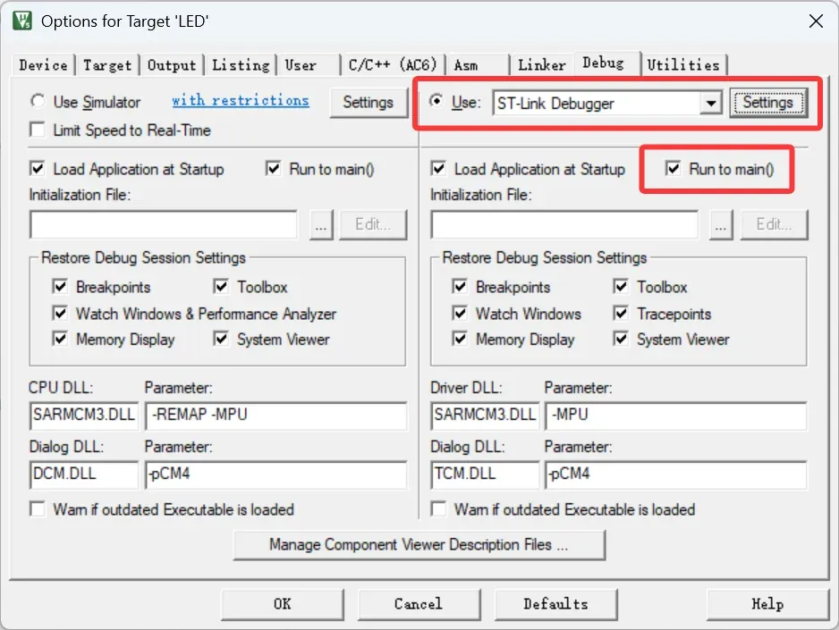 · 首先在Debug界面右侧(硬件调试方法,左侧为软件调试方法)选择对应的仿真器(或称下载器,目前使用的是更专用的ST-Link下载器,后续可能会用到更通用的DAP仿真器),并勾选下方Run to main()选项