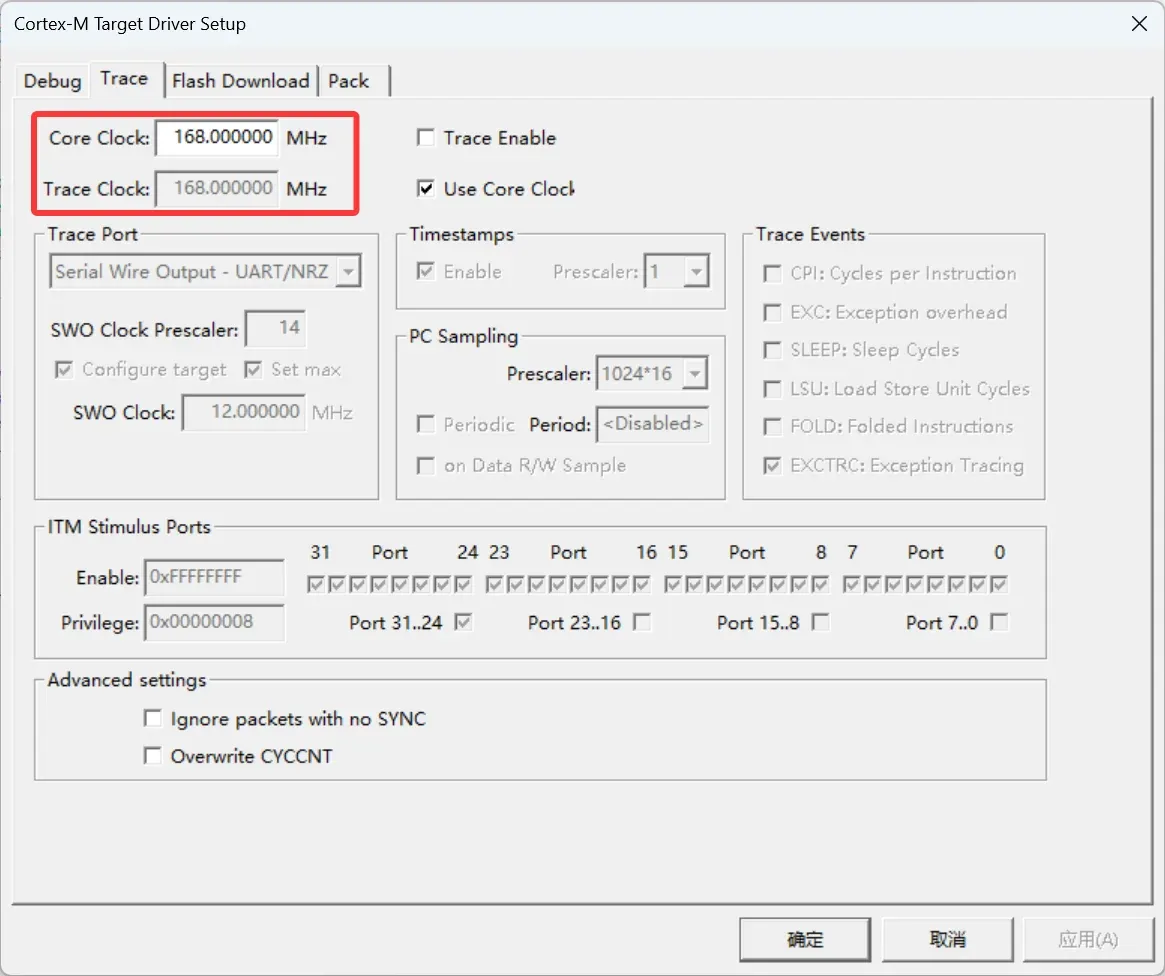 · 值得注意的是,在仿真器的Trace(时间调试相关设置)界面需要将Core Clock(芯片频率)设置成对应芯片的最大频率(根据需要适时调整,最大频率F1系列72MHz,F4系列168MHz),可在Keil界面的File - Devices Datebase界面中查询