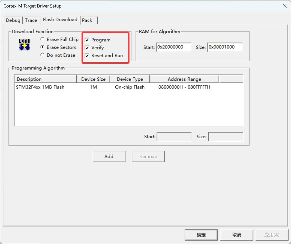 · 在闪存下载界面要讲Reset and Run选项勾选,另外左侧是下载前对芯片进行的操作(从上到下分别为擦除全片,擦除分区,不进行擦除)