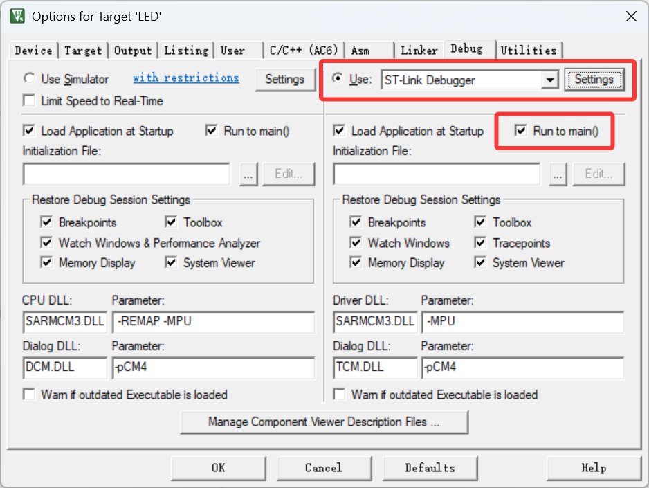 · 首先在Debug界面右侧(硬件调试方法,左侧为软件调试方法)选择对应的仿真器(或称下载器,目前使用的是更专用的ST-Link下载器,后续可能会用到更通用的DAP仿真器),并勾选下方Run to main()选项