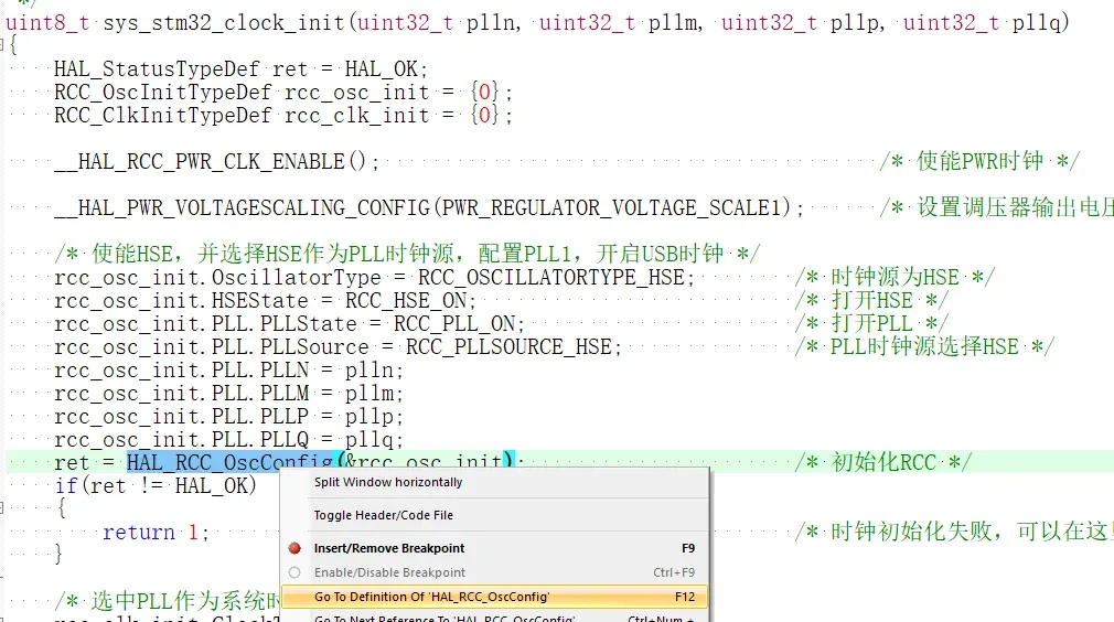 在完成Osc相关配置后调用了HAL_RCC_OscConfig()函数,输入内容即为前面定义的rcc_osc_init(注意:HAL_RCC_OscConfig()输入的形参为指针类型,这里应输入的是rcc_osc_init的地址即&rcc_osc_init)并将输出内容赋值给ret,若输出的ret不为OK则直接返回值,初始化失败。