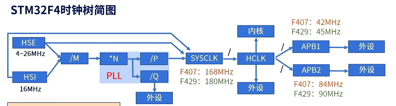 从上到下分别为PLL状态、PLL来源、PLL分/倍频系数M,N,P,Q(其中另有一个R隶属于F4的其他系列,此处的F407系列仅有MNPQ)。