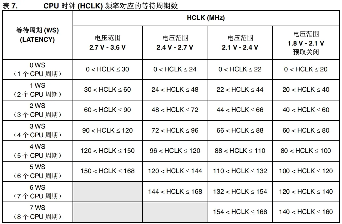 对应该值的定义我们要在STM32F4xx参考手册中找到表 7. CPU 时钟频率 (HCLK) 对应的等待周期数,内容如下:
