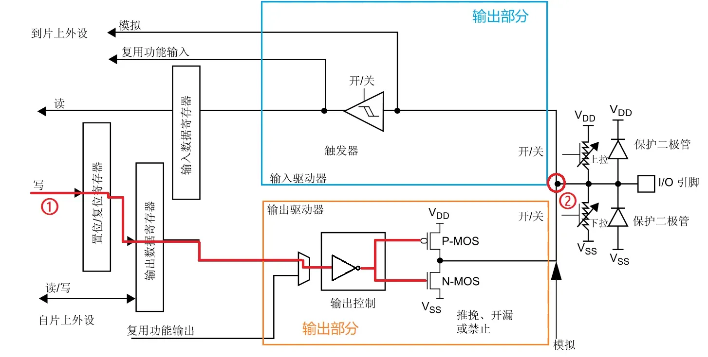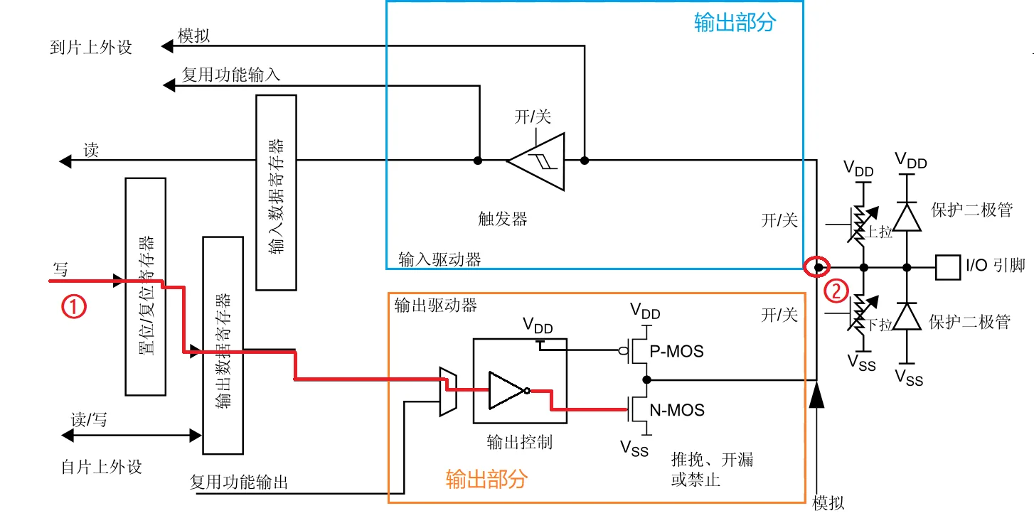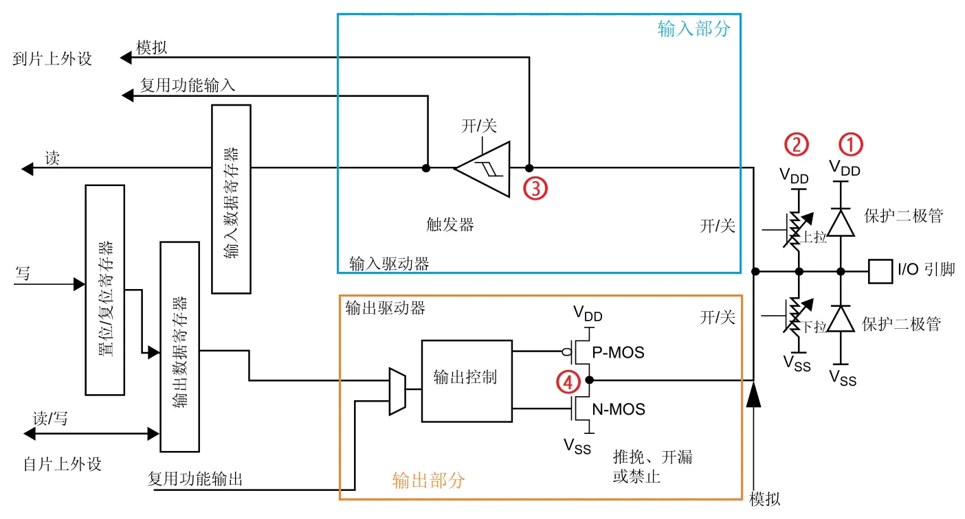 如图所示,除I/O引脚外,其余均为内部结构。内部结构中用于控制工作模式的主要有图中所标的 ①保护二极管 ②上下拉电阻 ③施密特触发器 ④P/N-MOS管,下面分别介绍其作用: