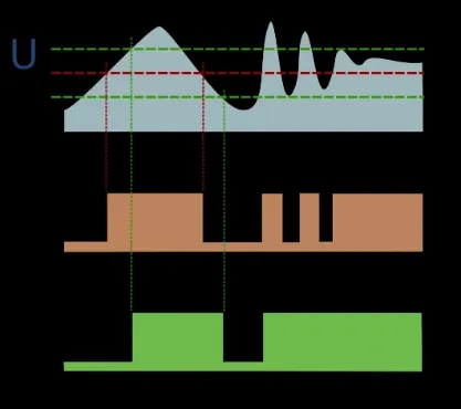 - 施密特触发器:其功能描述为:当输入电压高于正向阈值电压,输出为高;当输入电压低于负向阈值电压,输出为低;当输入在正负向阈值电压之间。具体作用就是用于波形整形,使输入信号具备一定的抗干扰能力(如图)
