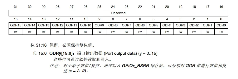 ODR,即Output Date Register,该寄存器用于控制 GPIOx 的输出高电平或者低电平,低16位有效,高16位保留,当 CPU 写访问该寄存器,如果对应的某位写 0(ODRy=0),则表示设置该 IO 口输出的是低电平,如果写 1(ODRy=1),则表示设置该 IO 口输出的是高电平,y=0~15。