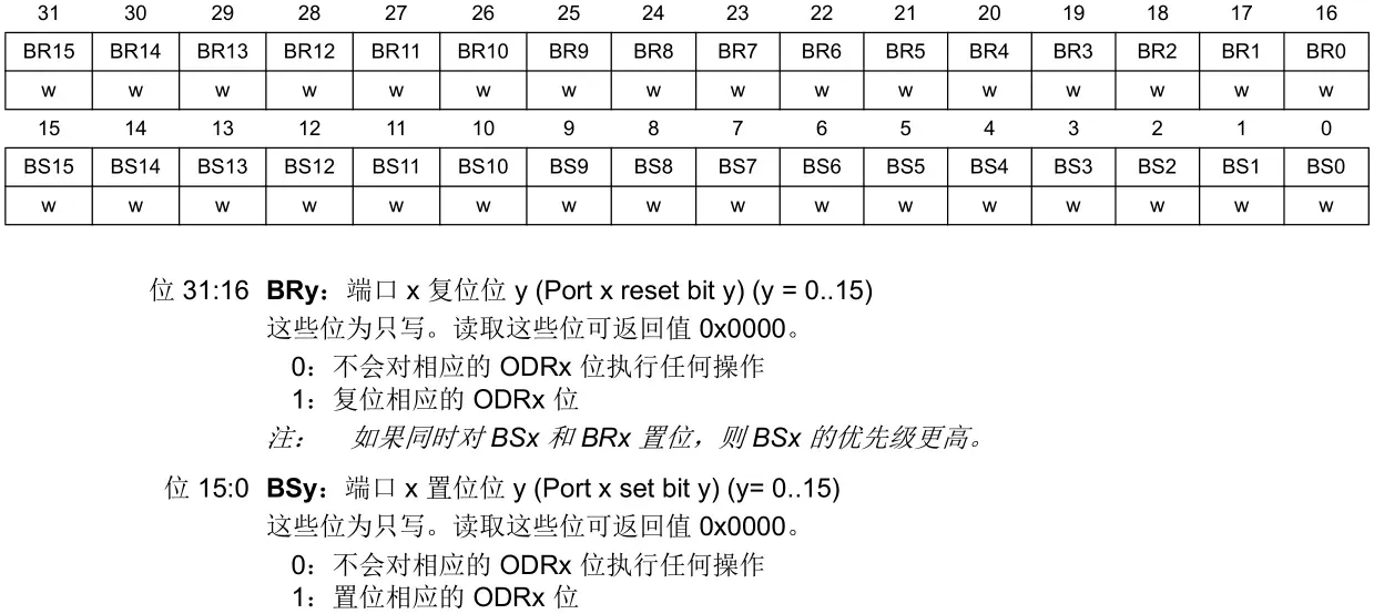 为什么有了 ODR 寄存器,还要这个 BDRR 寄存器呢?我们先看看 BSRR 的寄存器描述,首先 BSRR 是只写权限,而 ODR 是可读可写权限。BSRR 寄存器 32 位有效,对于低 16 位(0-15),我们往相应的位写 1(BSy=1),那么对应的 IO 口会输出高电平,往相应的位写 0(BSy=0),对 IO 口没有任何影响,高 16 位(16-31)作用刚好相反,对相应的位写 1(BRy=1)会输出低电平,写 0(BRy=0)没有任何影响,y=0~15。