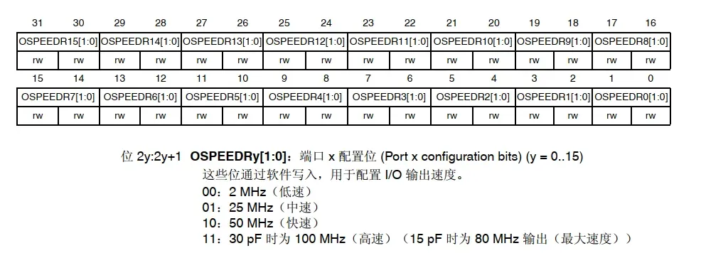 OSPEEDR,即Output Speed Register,用于控制输出速度,在MODER[1:0]=00/11的输入模式时不起作用。