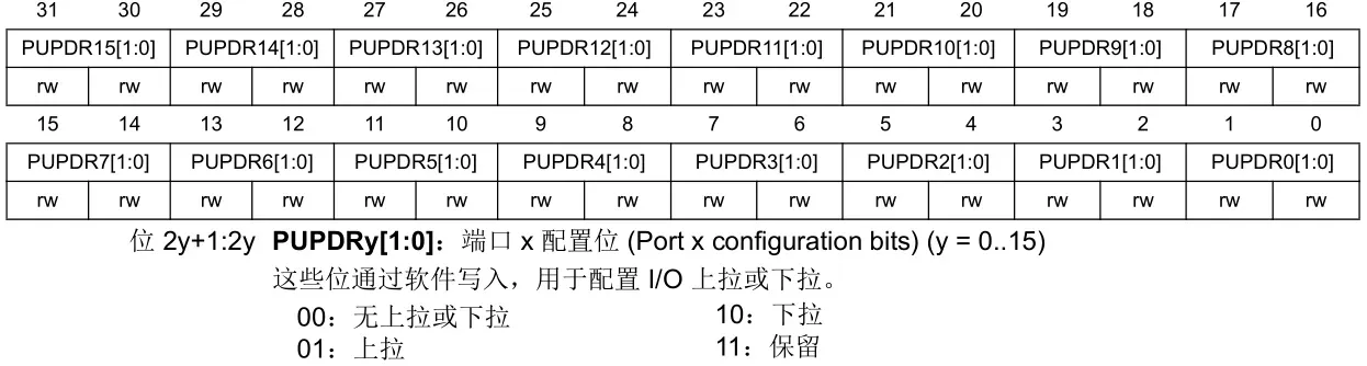 PUPDR,即Pull-Up/Down Register,用于设置上下拉电阻,复位值一般为0,即浮空状态。