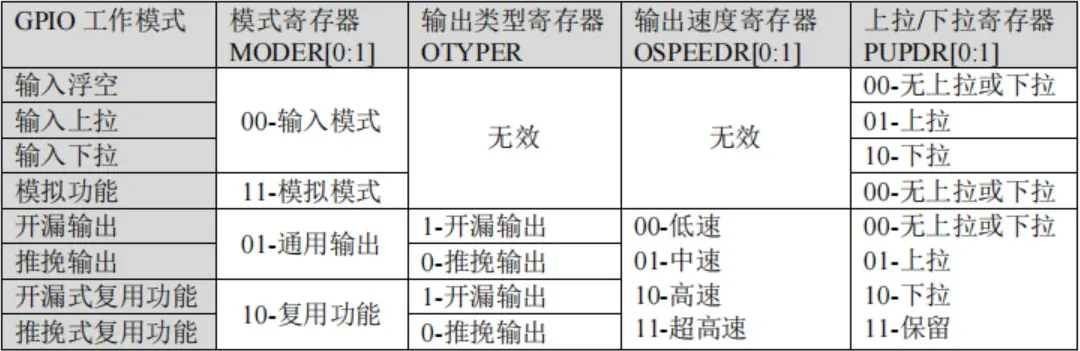以上四个寄存器用于配置GPIO的模式和状态,通关不同的组合得到: