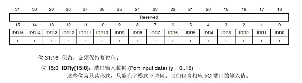 IDR,即Input Date Register,为只读寄存器,器用于获取 GPIOx 的输入高低电平,低16位有效,高16位保留,并且只能以 16 位的形式读出。读出的值为对应 IO 口的状态。