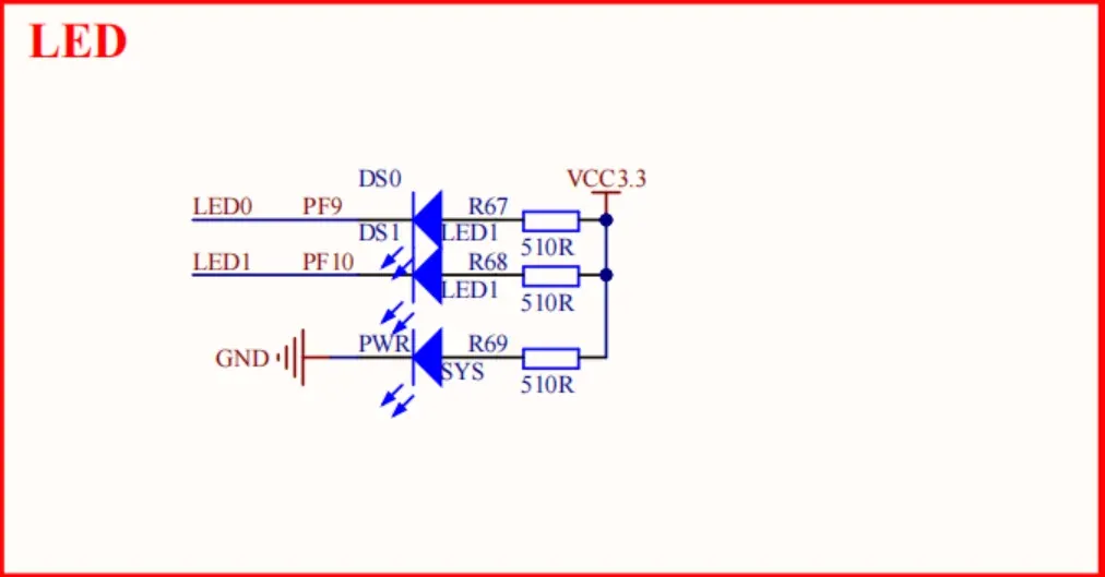- 查阅LED相关原理图:如下。可以得知两个LED分别挂载在PF9和PF10引脚上。此外我们还可以得知两个LED灯接的是3.3V的电压,因此要使LED能处于灭状态,我们输出的电压也要为高电平状态,因此这里的输出模式应使用推挽输出。