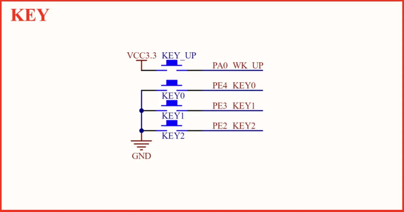 唯一要注意的是,KEY0/1/2的Pull成员均为GPIO_PULLUP即上拉模式,而KEY_UP的Pull成员为GPIO_PULLDOWN即下拉模式,此外输入模式中没有对速度的要求,因此无需定义Speed成员。