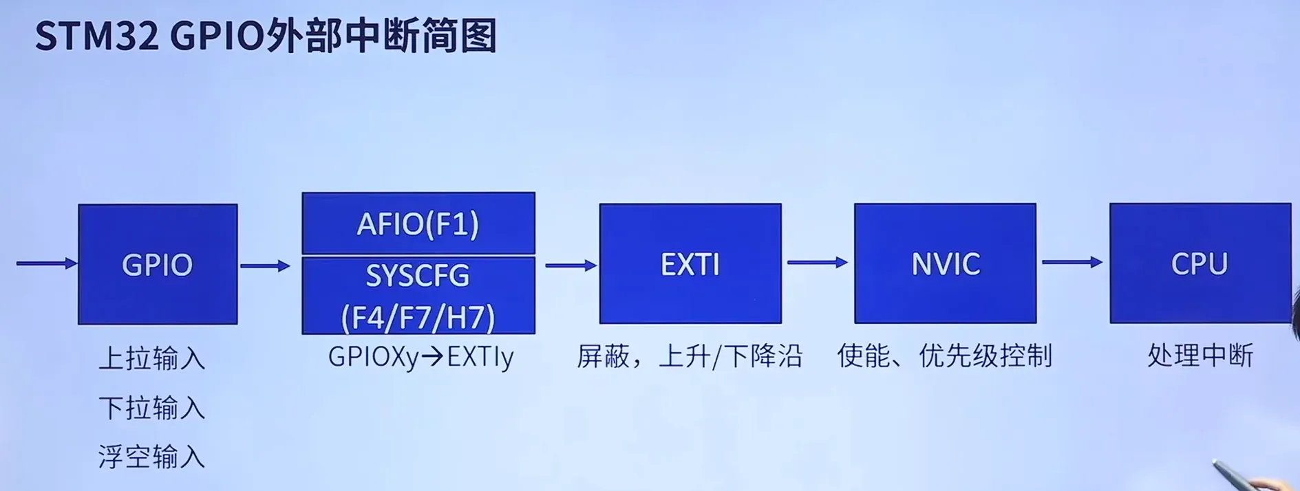 首先外部中断通过GPIO传递到SYSCFG(System Configuration)进而将信息写入EXTI进行初步处理,最后通过NVIC使能/除能相应中断并控制其优先级再交由CPU处理中断。