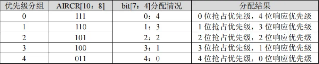 NVIC的优先级分组参考AIRCR寄存器的设置对IPR的高四位进行拆分能得到如下分组: