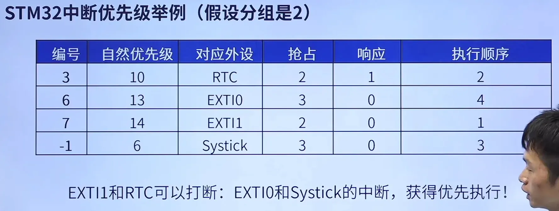 因此我们看到这个实例,先看抢占优先级,最小的为2,因此RTC和EXTI1的中断会更先执行,而这两者的响应优先级EXTI1小于RTC,于是最先处理的中断就是EXTI1,其次就是EXTI1;再看抢占优先级为3的EXTI0和Systick,不难发现他们的响应优先级也相同,这个时候我们看自然优先级,可以发现Systick的自然优先级为6小于EXTI0的13,因此Systick第三个执行,EXTI0最后执行。