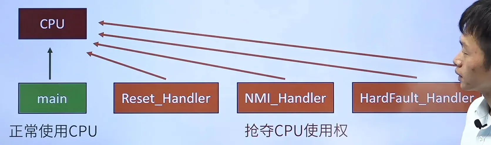 正常情况下CPU执行main函数,当CPU接受到中断信号时,在向量表中查找对应中断的中断服务函数,他们都可以抢断CPU的使用权,进而让CPU执行对应的中断服务函数。