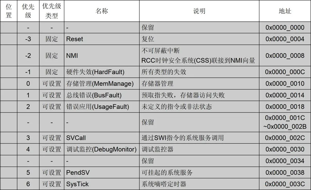 另外还有一种优先级为自然优先级,当抢占优先级和响应优先级都相同时比较自然优先级,自然优先级即中断向量表中的排序,三个优先级均遵循数值越小越优先的原则(对应到中断向量表就是越靠前越优先)。