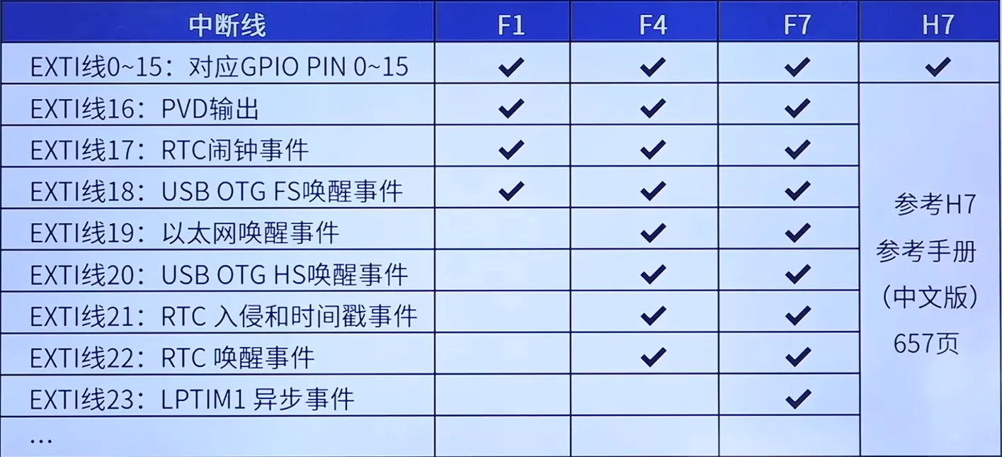如图,展示了各个系列支持的外部中断/事件请求,其中H7系列因其功率较高,因此提供了更多的中断选择来提高程序效率降低功耗。