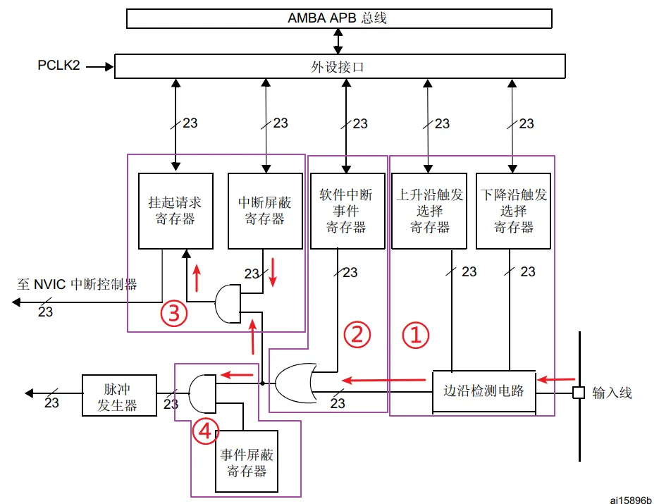 最后,请求挂起寄存器(EXTI_PR)的内容就输出到 NVIC 内,实现系统中断事件的控制。