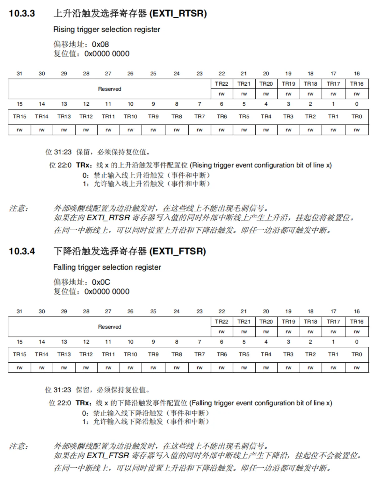 对上升/下降沿触发选择器,其0-22位使用(对应23条EXTI线),其余位保留,置1表示启用。
