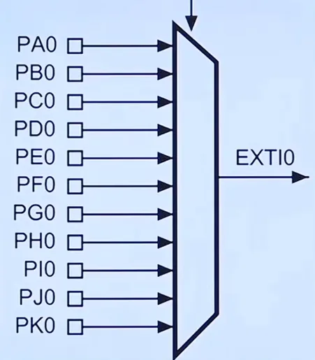简单来说,EXTIx中对应的x是多少,体现在PXx中就是PX的引脚号为多少,那端口号X呢?就是通过我们前面说到的EXTICR的[3:0]位域进行配置的。