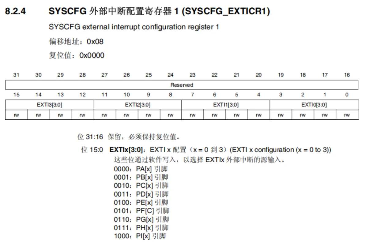 我们可以看到,EXTICR是一个32位寄存器,而它的高16位保留,只使用了0~15位,又将这16位分成了4组,即对应EXTI0~3,每个EXTIx都占用4个位,这四个位就决定了这个EXTI线到底连接的是哪个GPIO端口。
