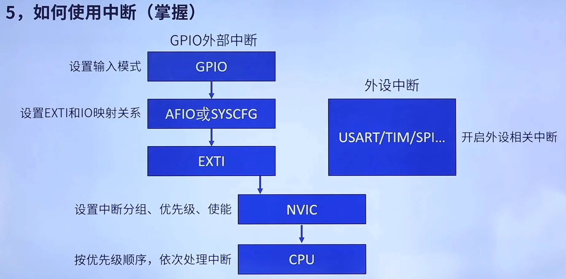 可以看到事实上和我们的外部中断简图是一致的,也就是先设置GPIO的输入模式,再设置EXTI和IO的映射关系将信号传导到EXTI,再经由EXTI传导到NVIC设置中断分组及优先级,并使能中断,最后在CPU处理中断。