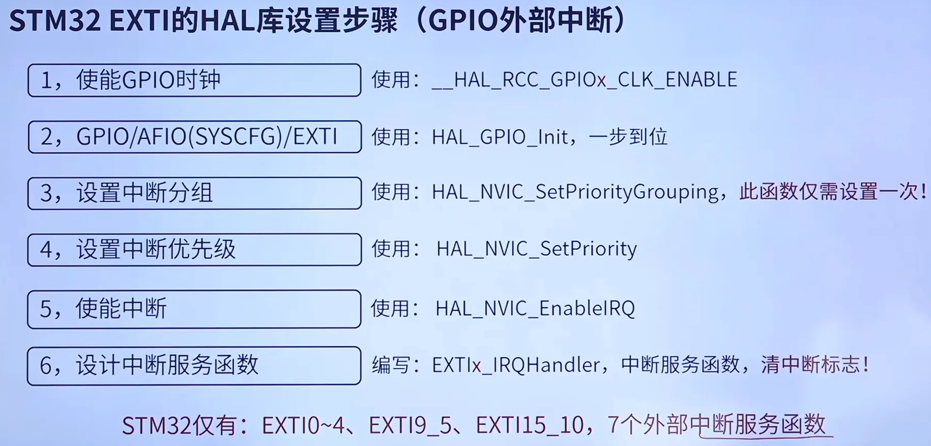 }具体实现过程参考函数实现了解就行,我们要知道的是在HAL_GPIO_Init函数中有单独一部分区域用于实现EXTI的中断初始化以及该区域内实现的功能,就不用再单独设置步骤2~5了。关于为什么能进行对应关系的设置,我们知道HAL_GPIO_Init输入的两个形参就是端口号和结构体,而结构体中就设置了引脚号,因此能进行一一对应。