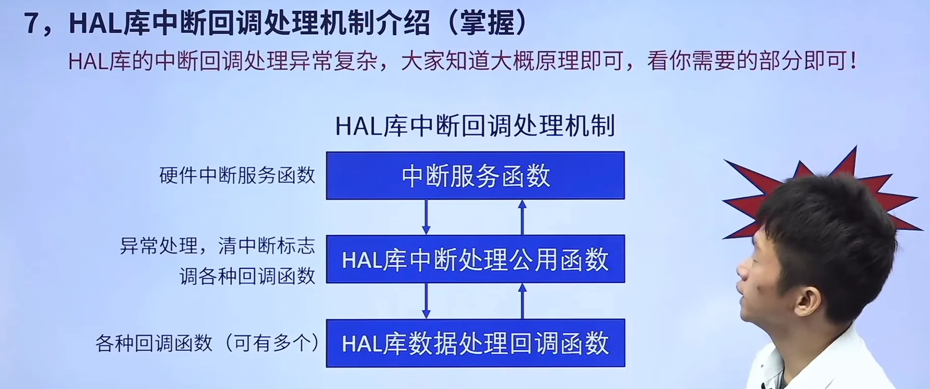 如图,在HAL库中,当系统接受到中断时,会先启用硬件中断服务函数,该函数调用了HAL库中断处理公用函数(EXTIx_IRQHandler,只有0~4,9_5,15_10共七个),在公用函数中又调用了数据处理回调函数(HAL_GPIO_EXTI_Callback(),弱定义函数,后续会提到),也就是在这个函数中我们才真正开始编写中断处理程序。最后再层层返回,将处理程序重新传回硬件中断服务函数。