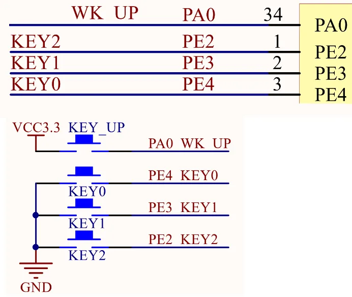 可以看到除KEY_UP外均为接地收集到低电平表示按钮按下,因此要设置上拉电阻,而KEY_UP则设置下拉电阻。