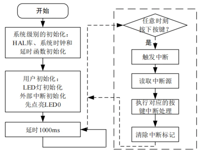 我们的主程序(左边部分)其实就是一直在循环延时一秒的这个操作,并在这个过程中处理中断程序,而右边部分就是我们的中断处理部分,逻辑其实和我们处理KEY按钮事件的程序差不多,都是在触发中断(按钮事件)后再读取一遍中断源(具体按钮状态)并执行对应操作最后清除中断标志(按钮状态),这一套逻辑本质上还是通用的,因此我们就能得到: