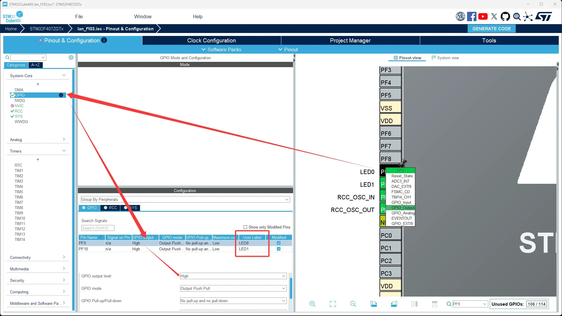 之后在配置界面的芯片图部分找到这两个针脚,并将其与GPIO_Output对应