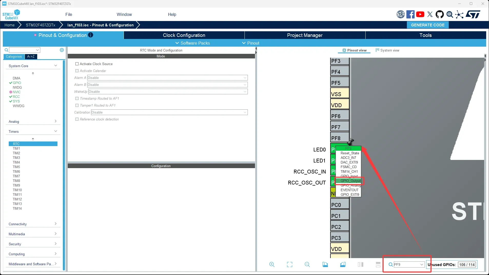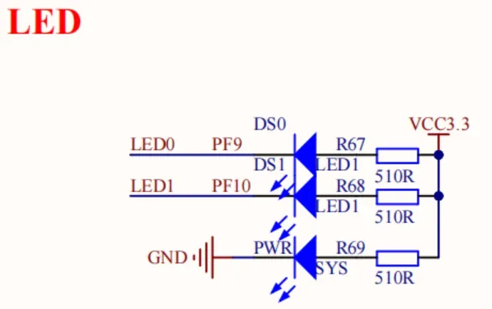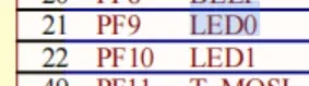 首先我们在原理图中知道,探索者的两个LED灯接入的针脚为PF9和PF10: