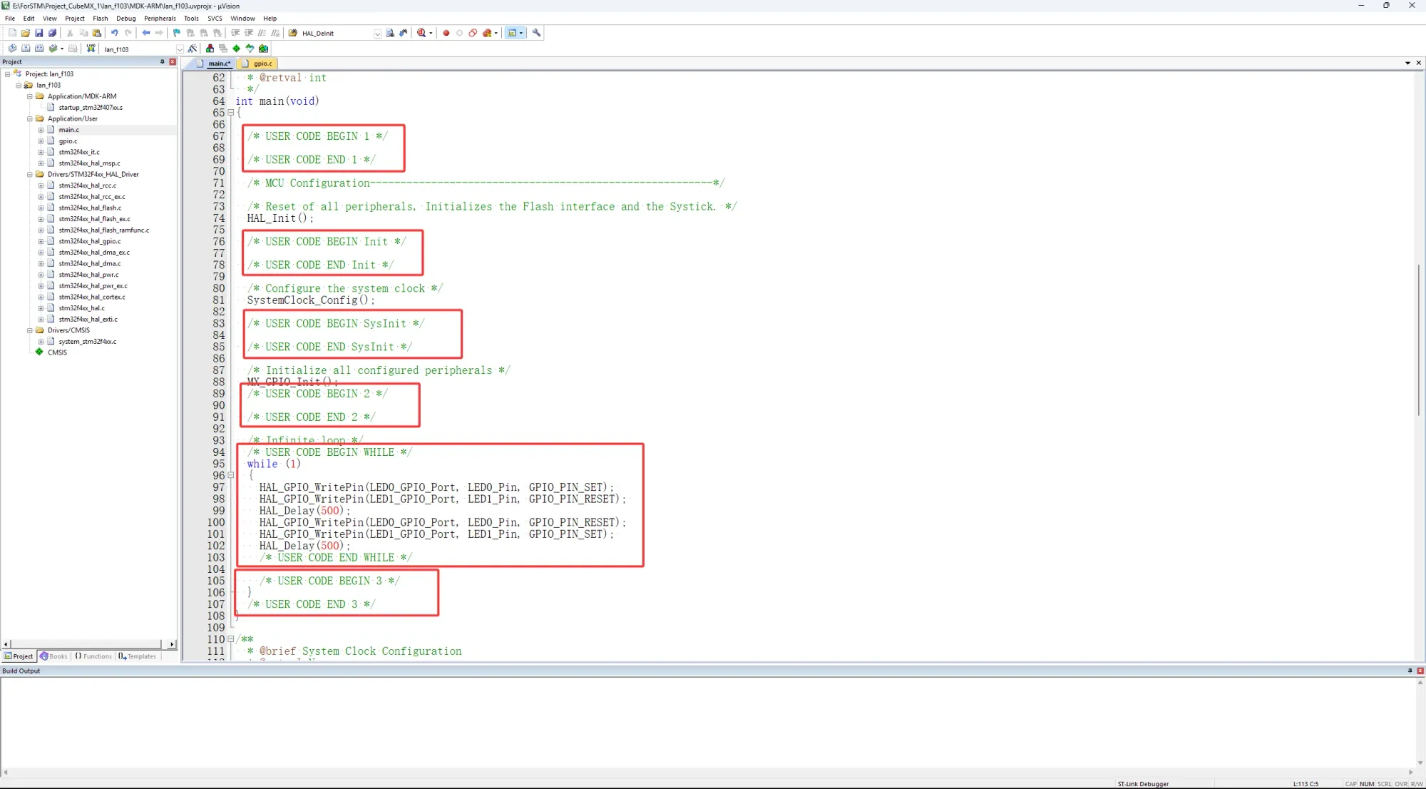 在Keil中打开工程文件,打开main.c文件,用户代码只可在下图中被BEGIN/END注释包围的部分编写,否则会被后续生成的初始化代码覆盖: