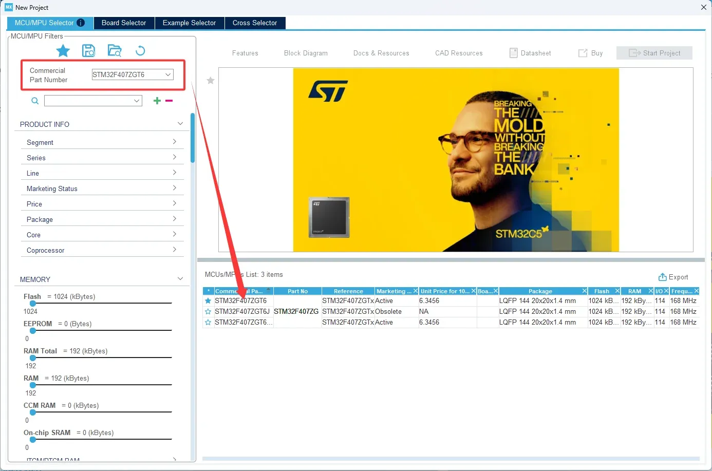 打开CubeMX,找到File->New Project,在MCU选项卡中输入对应芯片型号查找芯片,双击进入到配置界面即完成了工程初步建立。